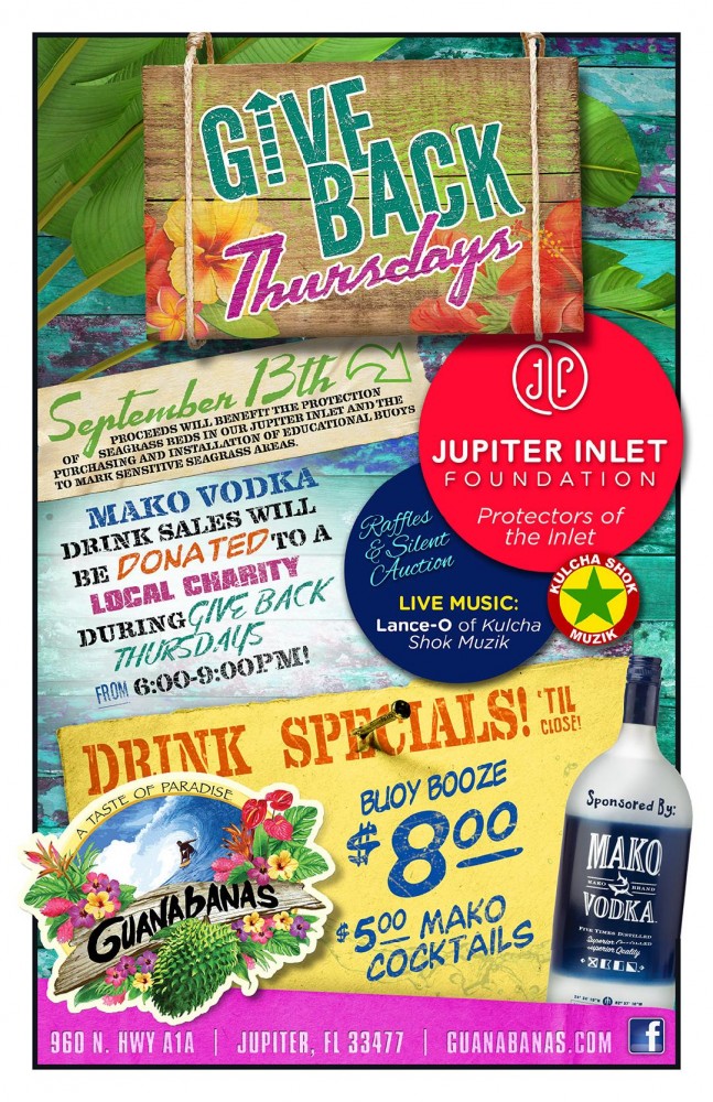 Join us on September 13th and help us Give Back to the Jupiter Inlet Foundation. Mako Vodka Drink Sales will be donated to benefit this Local Charity and fund the protection of Seagrass beds in Jupiter Inlet.