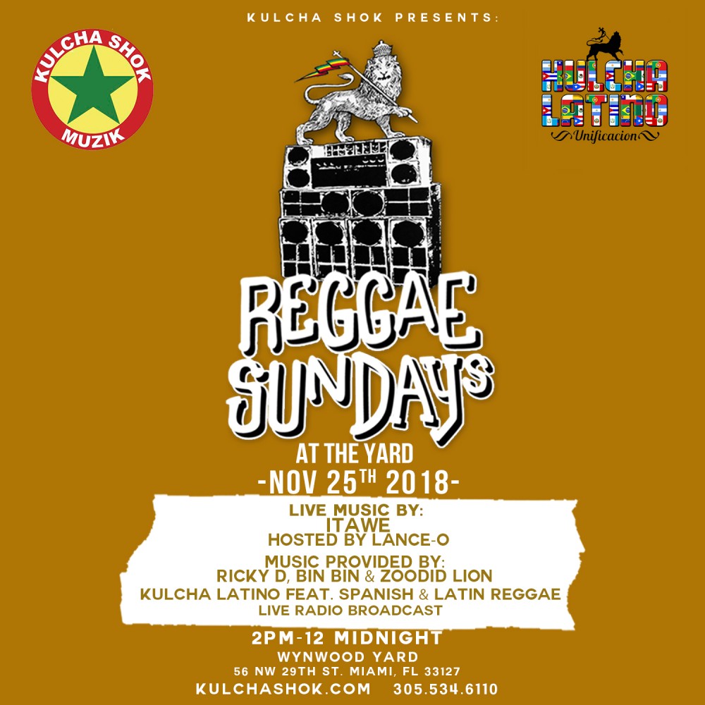 Sunday November 25th, 2018 Kulcha Shok Reggae Sundays A.K.A. Church is held at the beautiful outdoor venue Wynwood Yard. Live music from Itawe, and as always The Kulcha Shok Crew. Bands Play 6-7pm & 8-9pm, otherwise it's DJ time with Lance-O vibing every 4-6pm. Every 4th Sunday is Kulcha Latino, with a focus on Spanish and Latin Reggae Music.