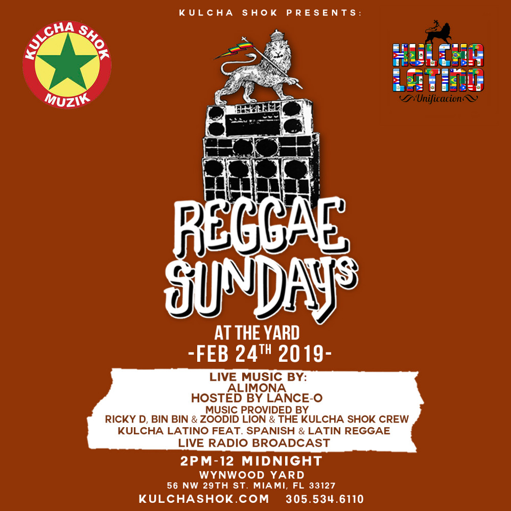 Sunday January 24th, 2019 Kulcha Shok Reggae Sundays A.K.A. Church is held at the beautiful outdoor venue Wynwood Yard. Live music from Alimona, and as always The Kulcha Shok Crew. Bands Play 6-7pm & 8-9pm, otherwise it's DJ time with Lance-O vibing every 4-6pm. Every 4th Sunday is Kulcha Latino, with a focus on Spanish and Latin Reggae Music.