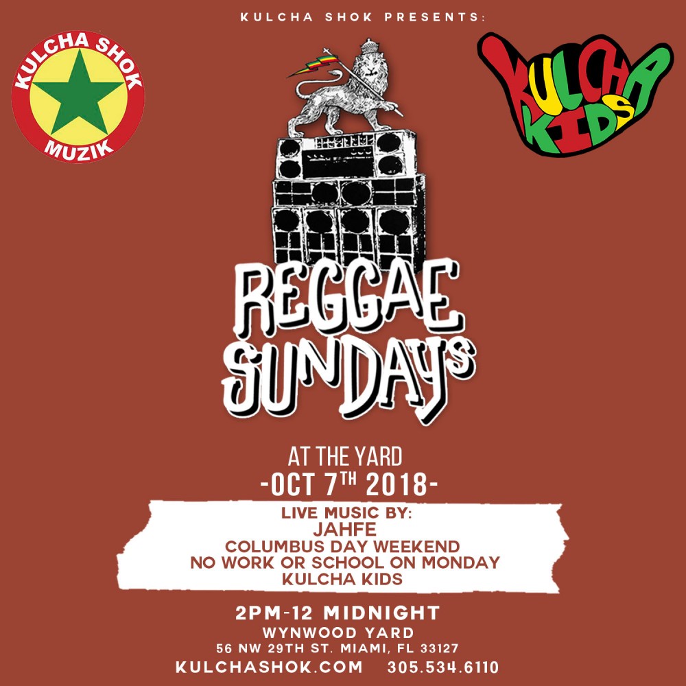 Sunday October 7th, 2018 Kulcha Shok Reggae Sundays A.K.A. Church is held at the beautiful outdoor venue Wynwood Yard. Live music from Jahfe and as always The Kulcha Shok Crew. Bands Play 6-7pm & 8-9pm, otherwise it's DJ time with Lance-O vibing every 4-6pm. Every 1st Sunday is Kulcha Kids!