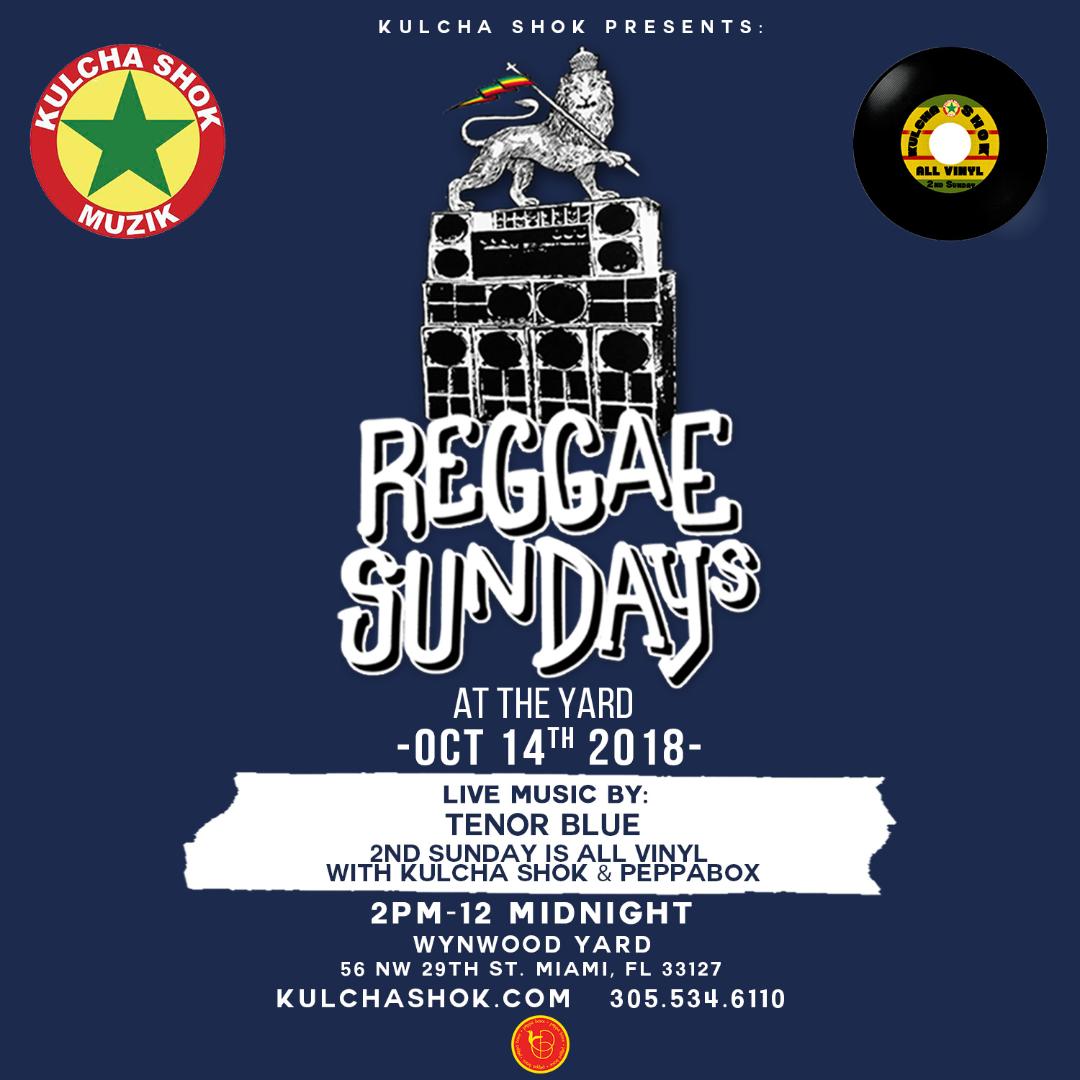 Sunday October 14th, 2018 Kulcha Shok Reggae Sundays A.K.A. Church is held at the beautiful outdoor venue Wynwood Yard. Live music from Tenor Blue and as always The Kulcha Shok Crew. Bands Play 6-7pm & 8-9pm, otherwise it's DJ time with Lance-O vibing every 4-6pm. Every 2nd Sunday is All Vinyl hosted by Kulcha Shok and Peppa Box!
