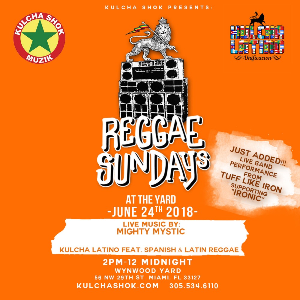 Sunday May 20th, 2018 Kulcha Shok Reggae Sundays A.K.A. Church is held at the beautiful outdoor venue Wynwood Yard. Live music from Mighty Mystic with a special appearance from Tuff like Iron, and as always The Kulcha Shok Crew. Bands Play 6-7pm & 8-9pm, otherwise it's DJ time with Lance-O vibing every 4-6pm. Every 4th Sunday is Kulcha Latino, with a focus on Spanish and Latin Reggae Music.