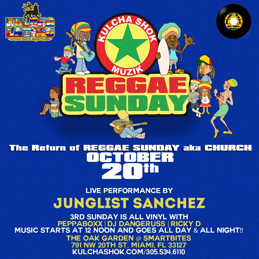 Sunday, October 20th, 2019 Kulcha Shok is very excited to continue it's new and improved Reggae Sundays A.K.A. Church at our new amazing outdoor venue : The Oak Garden @ Smartbites. This week we welcome Junglist Sanchez, and as always The Kulcha Shok Crew rocking you in between sets. 3rd Sundays are always all Vinyl with Peppabox, DJ Dangeruss and Ricky D.