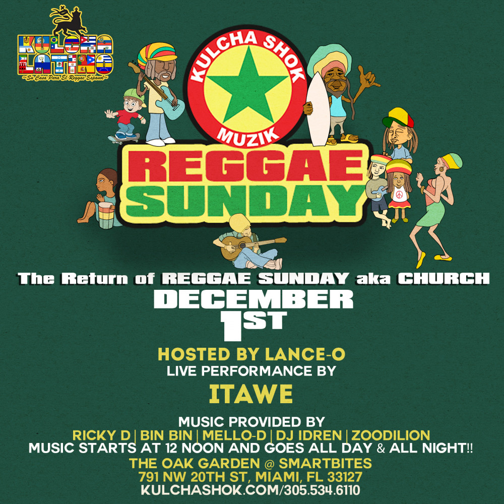 Sunday, December 1st, 2019 Kulcha Shok is very excited to continue it's new and improved Reggae Sundays A.K.A. Church at our new amazing outdoor venue : The Oak Garden @ Smartbites. This week we Itawe of Locos por Juana presenting Marley Brown, and as always The Kulcha Shok Crew rocking you in between sets.