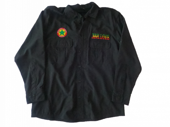 Show your Love for His Majesty and stay cool in this lightweight, long sleeve, open air style button up Soul Jah. This shirt features a blend of durable water repellent polyester and cotton blend, mesh lining with open back designed to let air flow, as well as 2 built in zippered and velcro hidden pockets. Two front pockets also velcro shut.