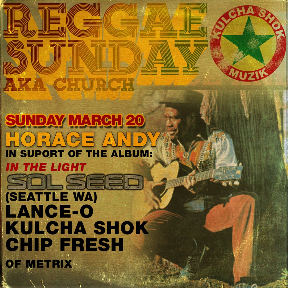 Sunday March 20 Reggae Sundays, AKA 'Church' featuring Horace Andy performing live downstairs/ upstairs Lance-O & the Kulcha Shok Krew + Chip Fresh.