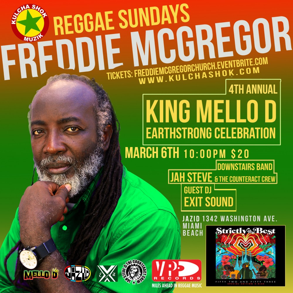 Sunday March 6, 2016 Reggae Sundays 'AKA' Church presents the 4th Annual performance by Freddie McGregor for Mello D's Earthstrong.