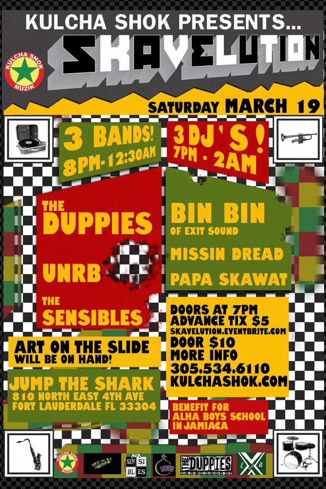 Kulcha Shok presents Skavelution, 3 Bands and 3 DJ's, The Duppies, UNRB, The Sensibles, DJ Bin Bin, DJ Missin Dread, and DJ Papa Skawat.
