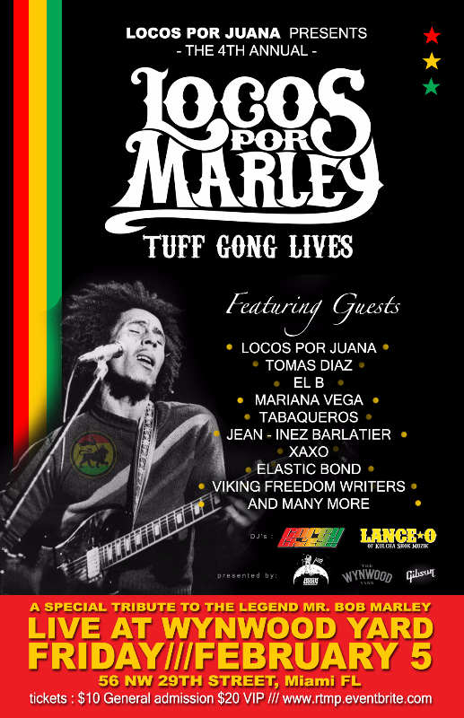 A tribute to Bob Marley featuring Locos Por Juana, Tomas Diaz, El B, Mariana Vega, Tabaqueros, Jean-Inez Barlatier, XAXO, Elastic Bond, Viking Freedom Writers and More! Also Muzik by Lance-O of Kulcha Shok Muzik.