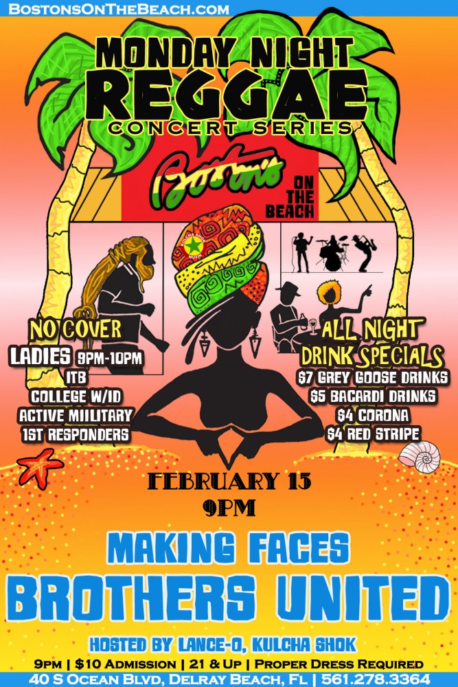 Monday February 15, Monday Night Reggae the Concert Series with Brothers United, Making Faces, and Lance-O of Kulcha Shok Muzik. 9p-2a at Boston's on the Beach 40 S Ocean Blvd Delray Beach $10