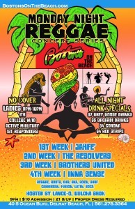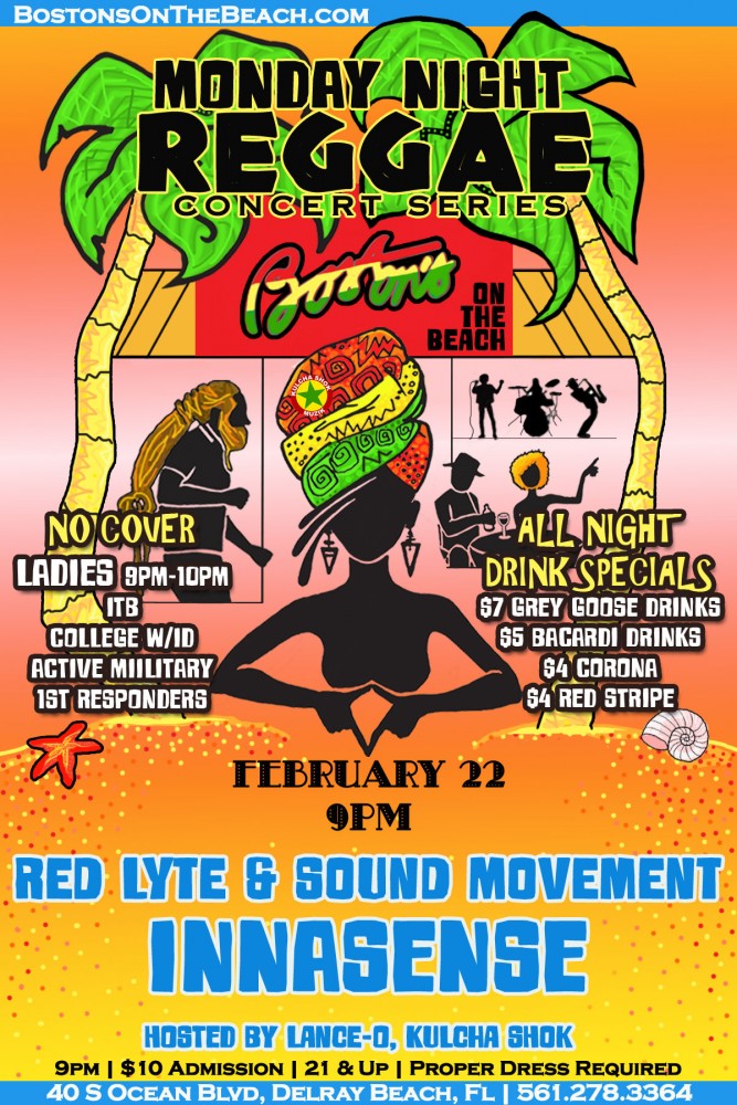 Monday February 22, Monday Night Reggae the Concert Series with Innasense, Red Lyte & Sound Movement, and Lance-O of Kulcha Shok Muzik. 9p-2a at Boston's on the Beach 40 S Ocean Blvd Delray Beach $10