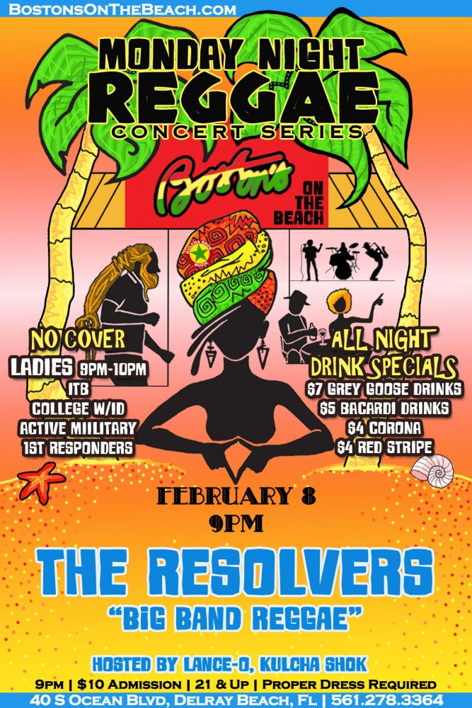 Monday February 8, Monday Night Reggae the Concert Series with The Resolvers and Lance-O of Kulcha Shok Muzik. 9p-2a at Boston's on the Beach 40 S Ocean Blvd Delray Beach $10