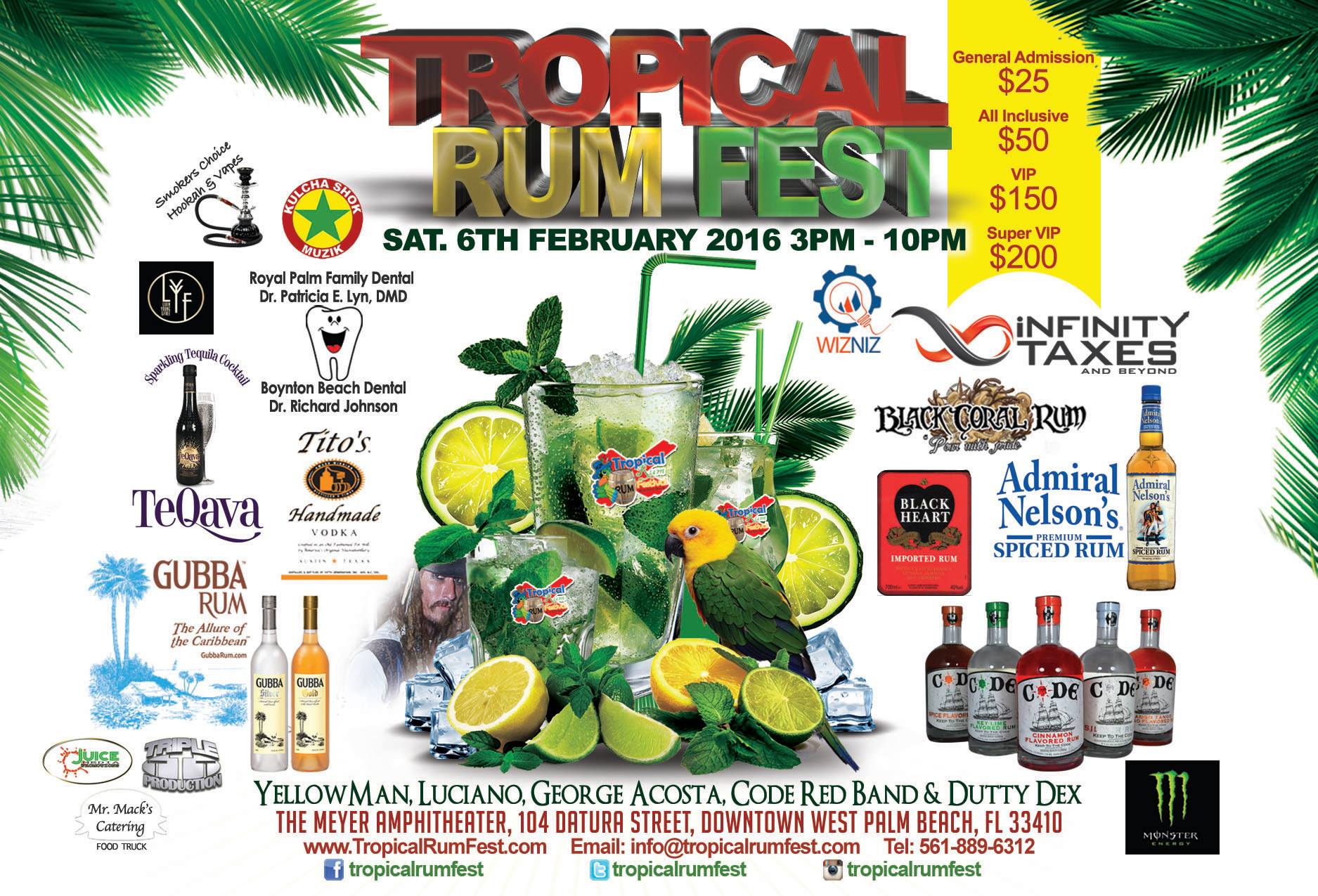 Downtown West Palm Beach welcomes the 4th Annual Tropical Rum Fest Feb 6, 2016. Luciano, Yellowman, Code Red Band, George Acosta, and Dutty Dex. MCed by Lance-O of Kulcha Shok Muzik
