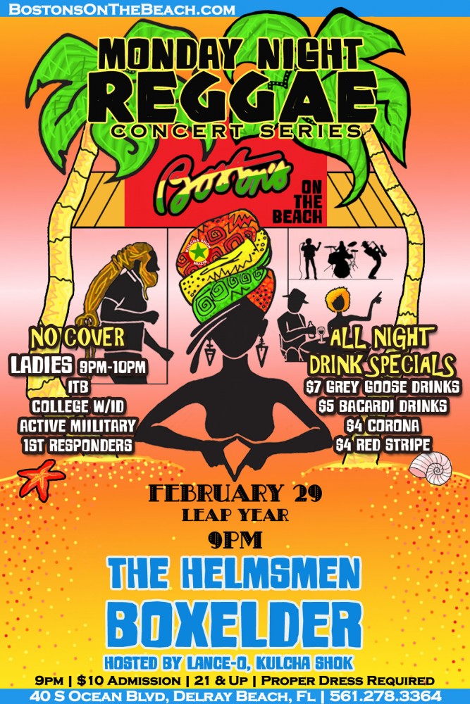Monday February 29, Monday Night Reggae the Concert Series with Boxelder, The Helmsman, and Lance-O of Kulcha Shok Muzik. 9p-2a at Boston's on the Beach 40 S Ocean Blvd Delray Beach $10