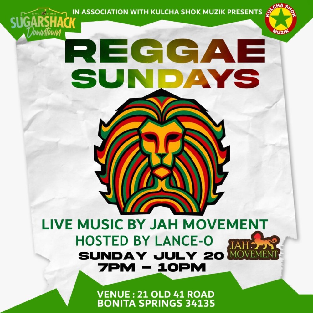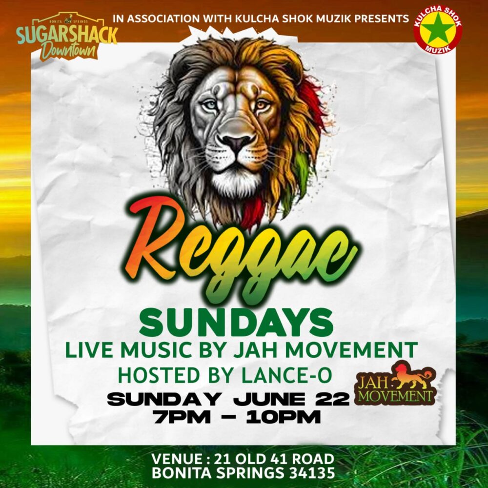 Kulcha Shok Presents Reggae Sunday june 22 sugar shack Kulcha Shok & Lance-O will MC DJ & host Reggae Sundays @SugarShack_Downtown Sunday June 22 along side a Florida Favorite Jah Movement Band free admission & when Lance-O plays we start at 630pm to 1015pm bring the kids bands start at 7pm end at 10pm