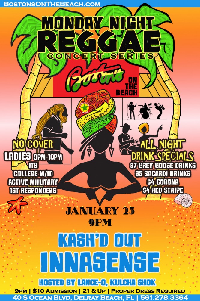 Boston's on the Beach 40 South Ocean Boulevard, Delray Beach, FL, United StatesMonday January 25, Monday Night Reggae the Concert Series with Kash'd Out, Innasense, & Lance-O of Kulcha Shok Muzik. 9p-2a at Bostons on the Beach 40 S Ocean Blvd Delray Beach $10